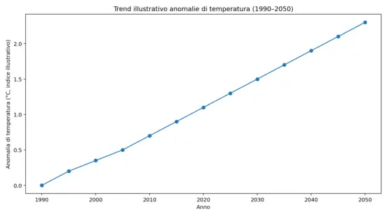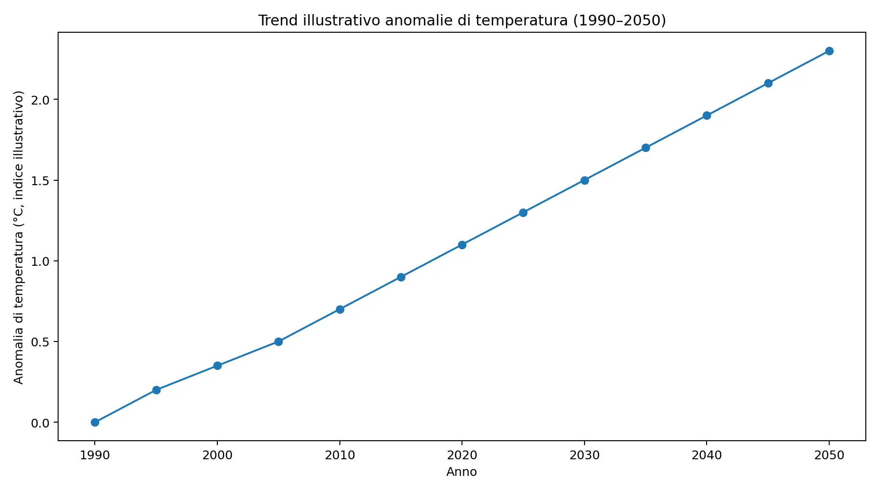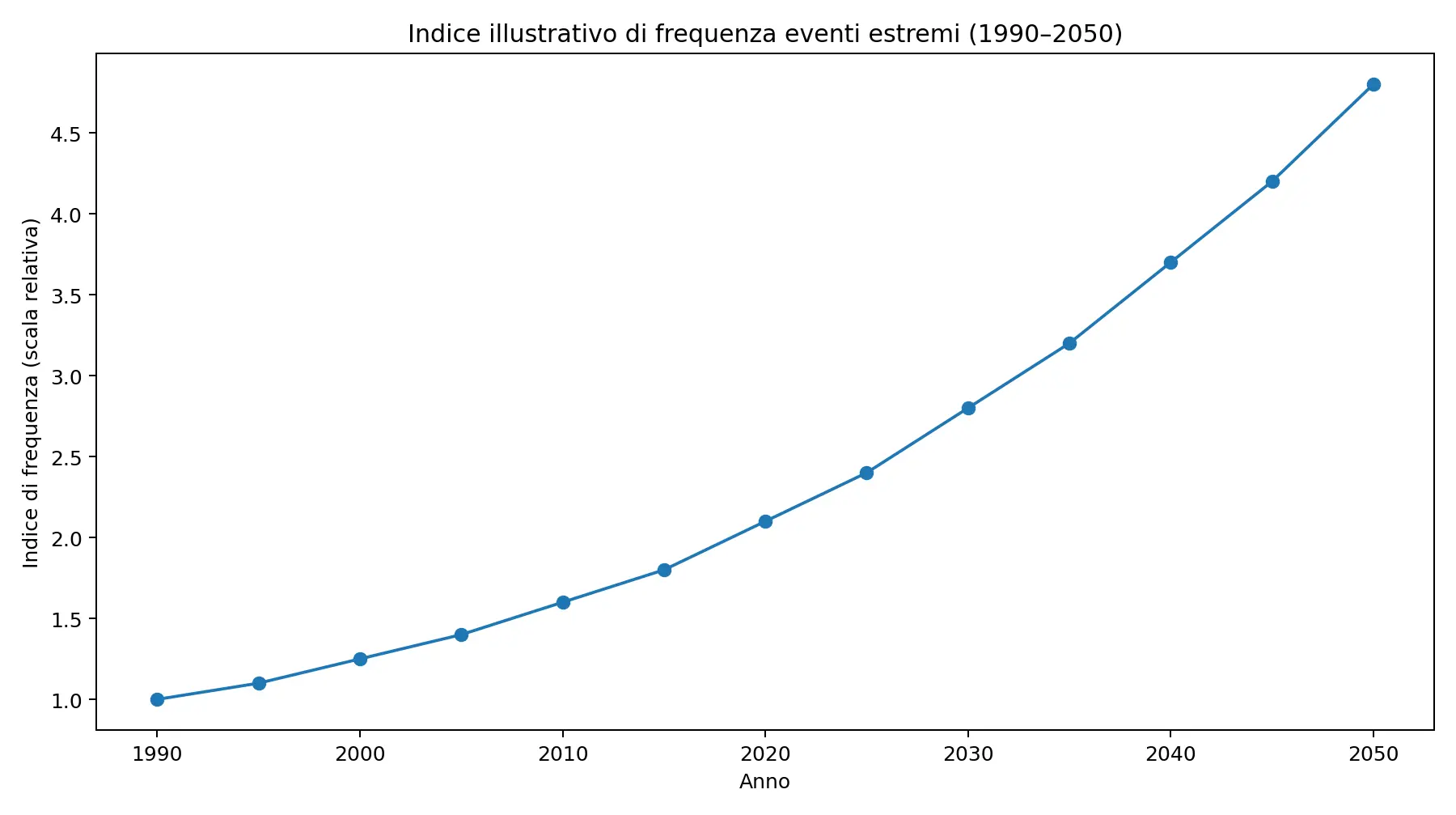 I grafici rappresentano traiettorie di scenario a fini interpretativi: servono a visualizzare come, nel tempo, l’aumento delle temperature e la maggiore frequenza di eventi estremi possano configurarsi come fenomeni cumulativi e interconnessi.